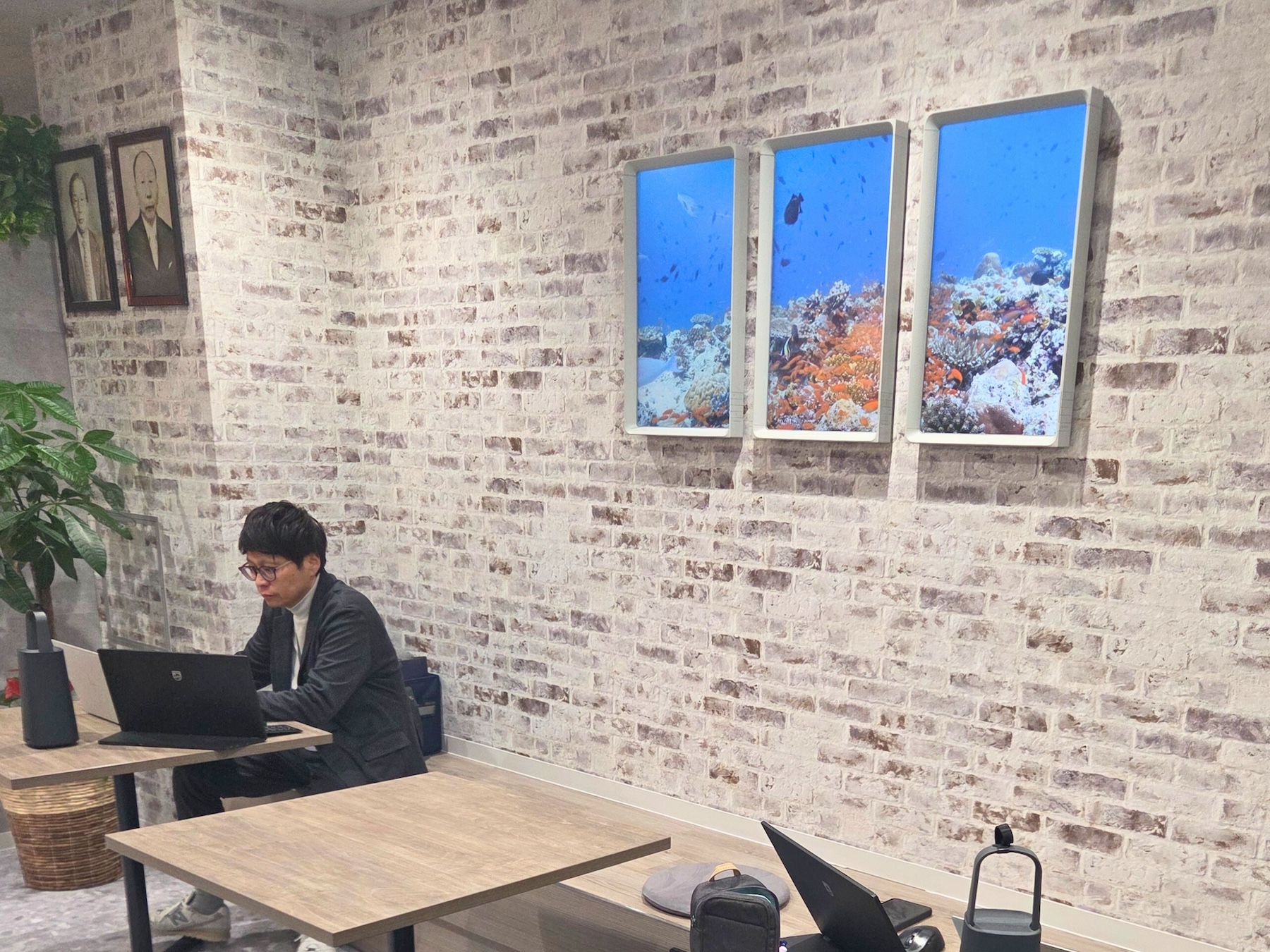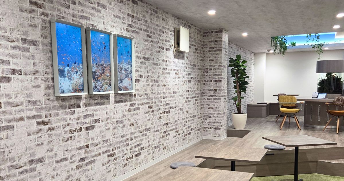 We particularly prefer displaying underwater and fish scenery. Our office renovation design concept is "Water City Osaka" (Aqua Metropolis Osaka), and since we also incorporated a flowing water wall and an aquarium, the digital views match the spatial image perfectly.