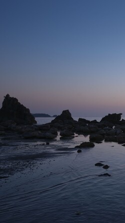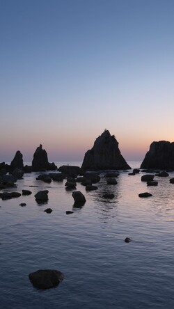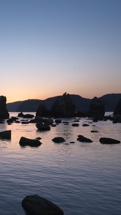 Hashiguiiwa is a line of unusual rock formations stretching about 850 meters from the coast of Kushimoto toward Oshima Island across the sea. More than 40 rocks stand in a row, resembling the piles of a bridge—hence the name “hashi (bridge) gui (pile) iwa (rock).” Designated as both a Place of Scenic Beauty and a Natural Monument of Japan, this remarkable natural formation changes in appearance depending on the weather and time of day. It is especially known for its beauty at dawn, when the sun rises between the rocks.